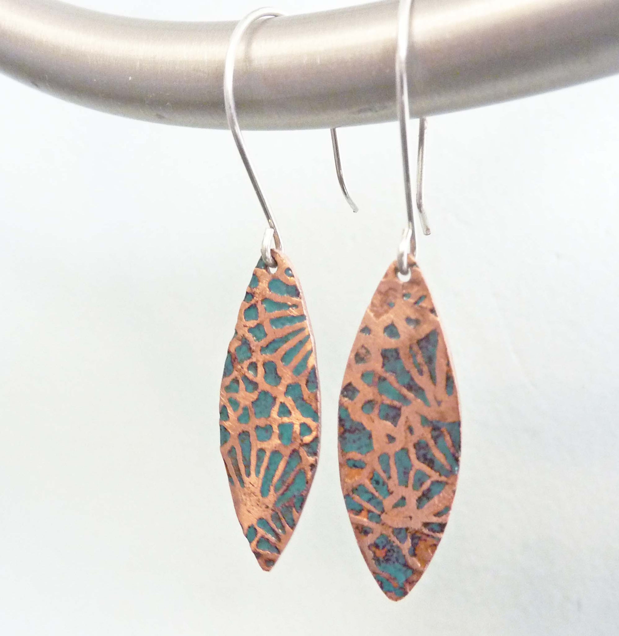 Copper earrings are hand-cut into a leaf or marquise shape from copper sheet and etched with a Japanese flower pattern. Champlevé is an enameling technique in which troughs or cells are carved, etched, die struck, or cast into the surface of a metal object, and filled with vitreous enamel. The piece is then fired until the enamel fuses, and when cooled the surface of the object is polished. The uncarved portions of the original surface remain visible as a frame for the enamel designs. The name comes from the French for "raised field".