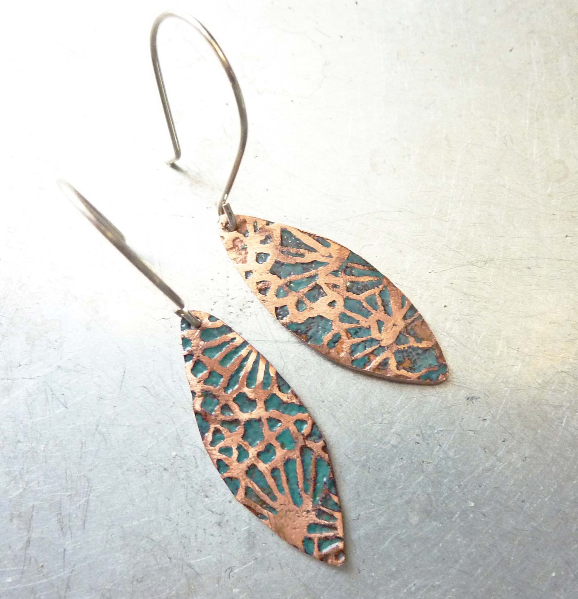 I've applied metal sealant to the finished earrings in order to protect the polished surface. Earrings measure 2" long x 1/2" wide. Ear wires are hand-made sterling silver. Lead and nickel-free antique copper ear wires are also available as an option.