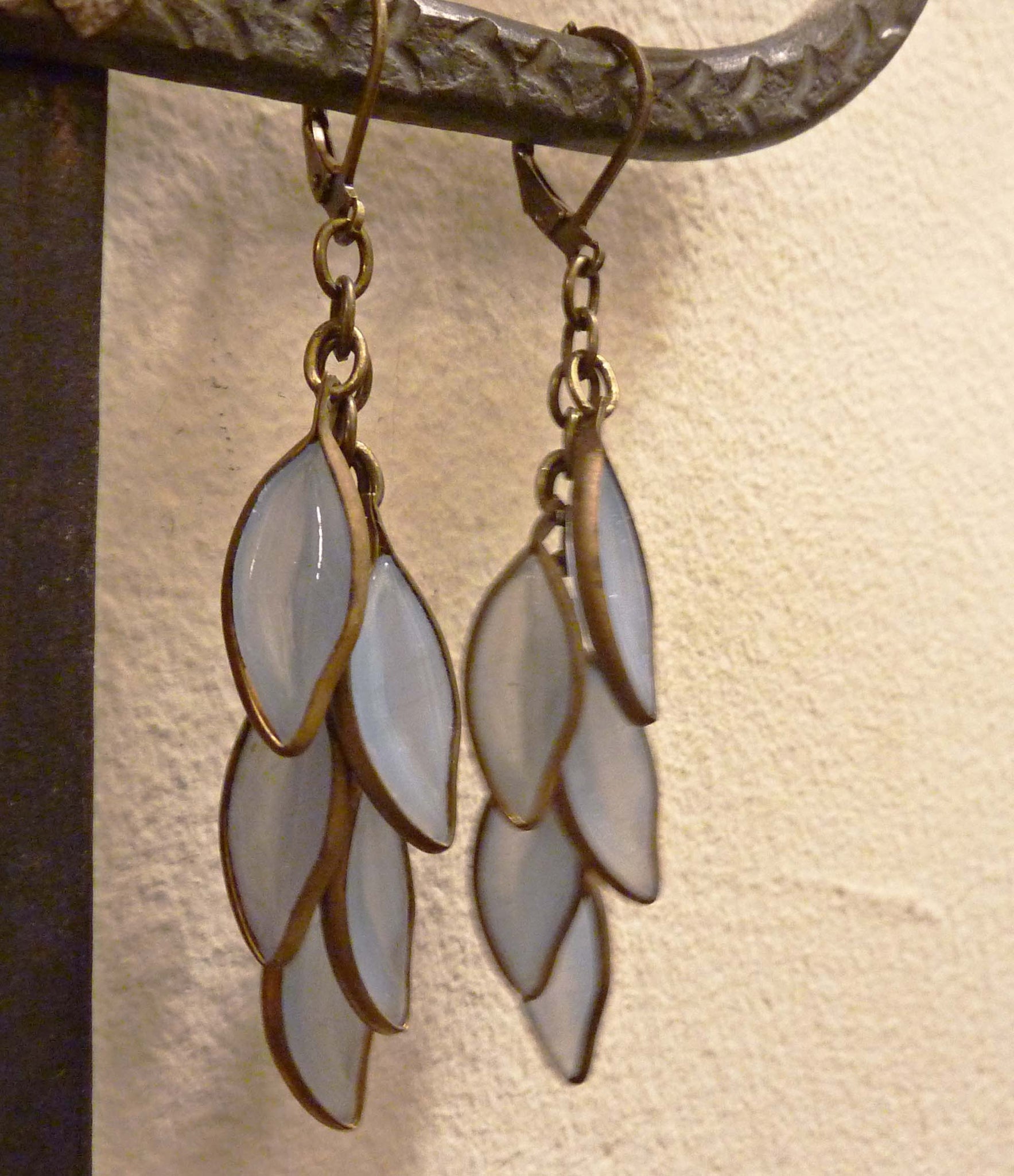 The Cascading Leaves Earrings have been so popular in green that I'm excited to introduce a similar bead style in a gorgeous shade of light lavender. Sensational and rare vintage smooth glass leaves set in brass channels cascade from textured oxidized brass chain. These look amazing on, and have a beautiful drape. Hypoallergenic oxidized brass ear lever-back ear wires are secure, and lead and nickel-free.