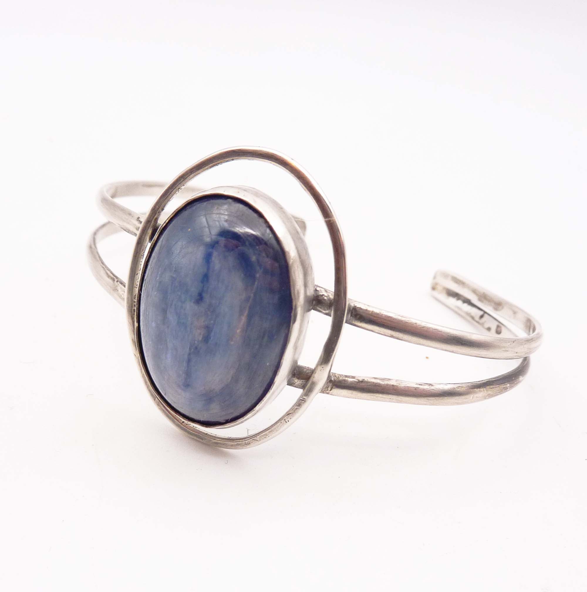 This beautiful Kyanite gemstone is hand-fabricated into a stunning and sleek cuff bracelet. The stone has iridescent blue colors with a fabulous play of light and dimension across the stone's surface. It's set in a hand-soldered sterling silver wire double band with a fine silver bezel setting. The setting uses half-round wire for extra comfort on the wrist. I've kept bezel and outer ring shiny while the cuff itself has a brushed finish.