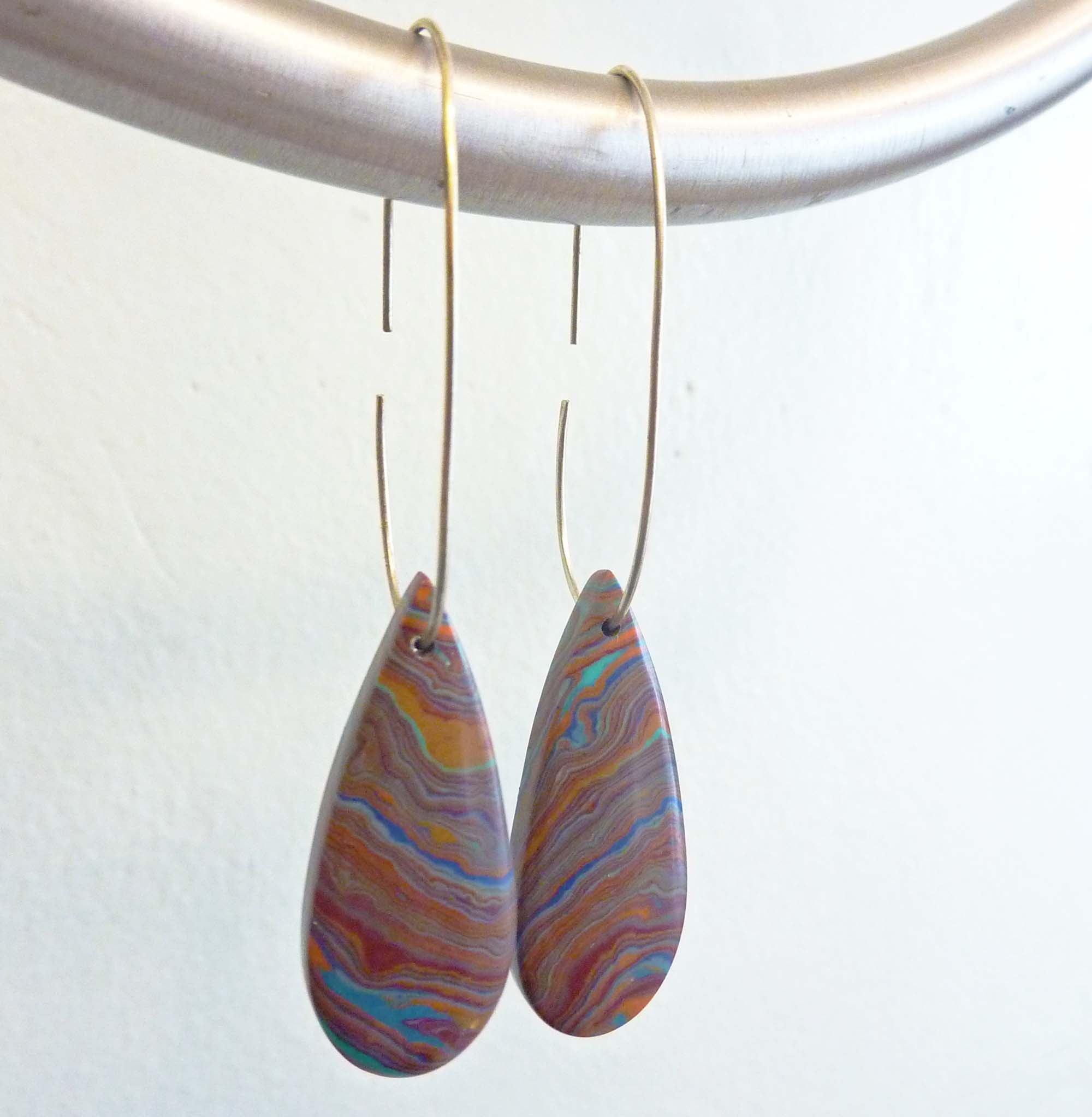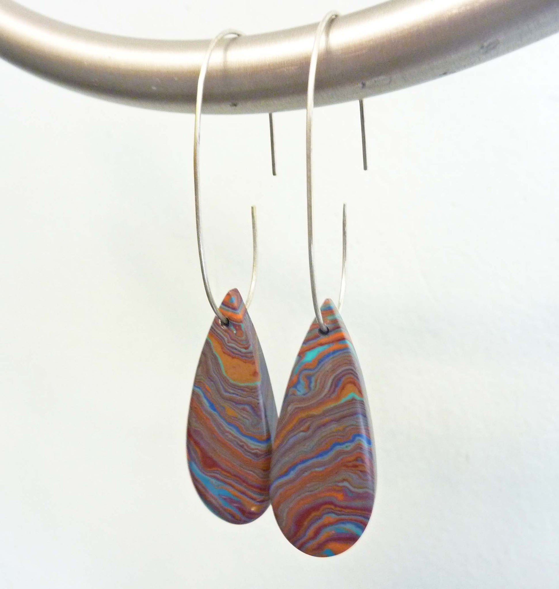 Fabulous hoop earrings with multi-colored striped stones in a teardrop shape. Uniquely beautiful, wear-with-anything style. Hand-formed oval sterling silver hoop ear wires.