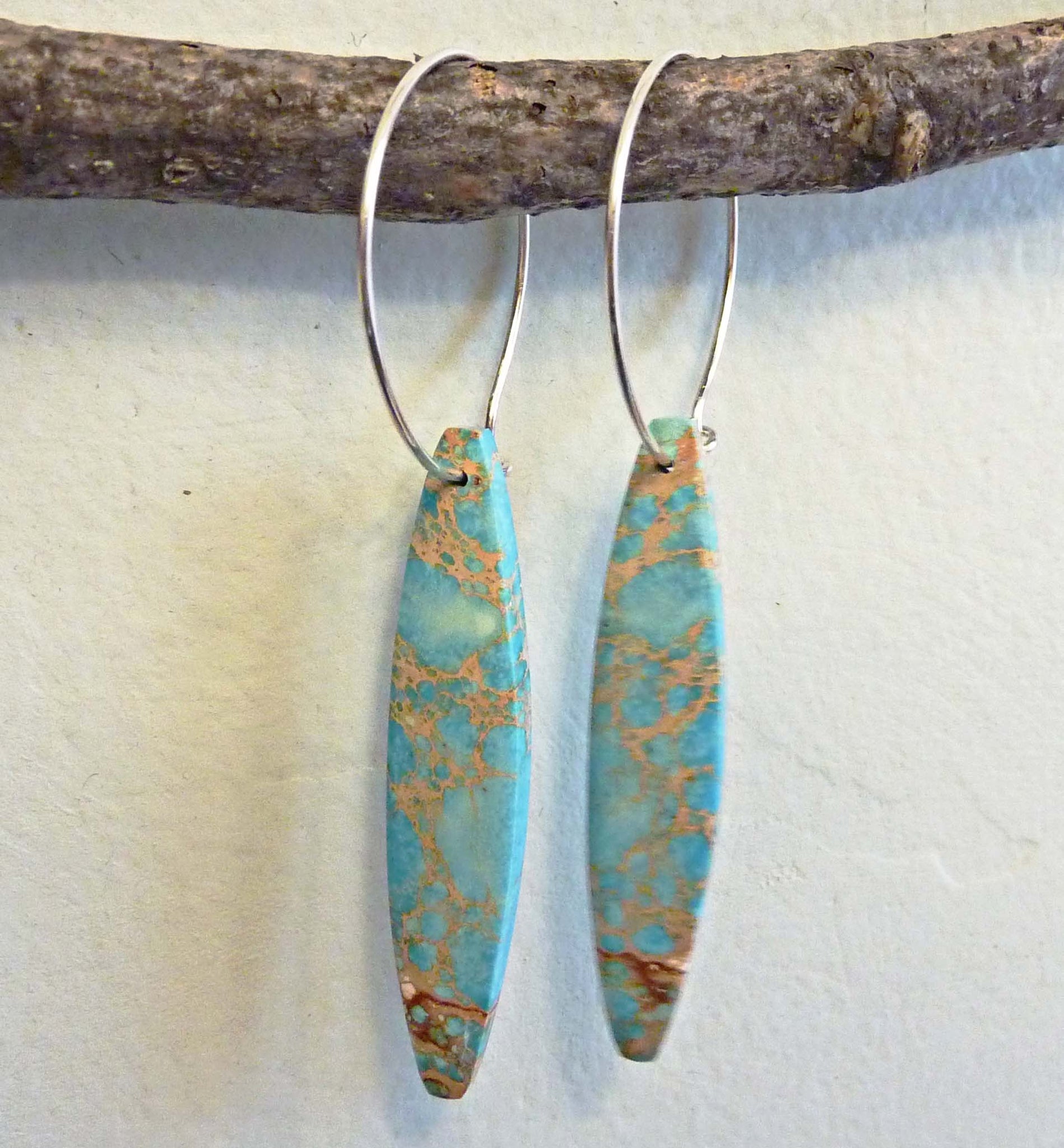 Fabulous statement earrings with turquoise Sea Sediment Jasper stones shot through with pale golden occusions in a modern marquise shape. Uniquely beautiful, wear-with-anything style. Hand-formed rounded sterling silver hoop ear wires. Earrings measure 2 7/8" long x 7/8" wide.