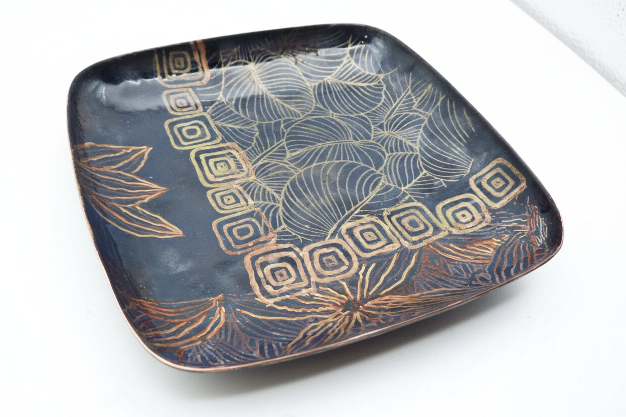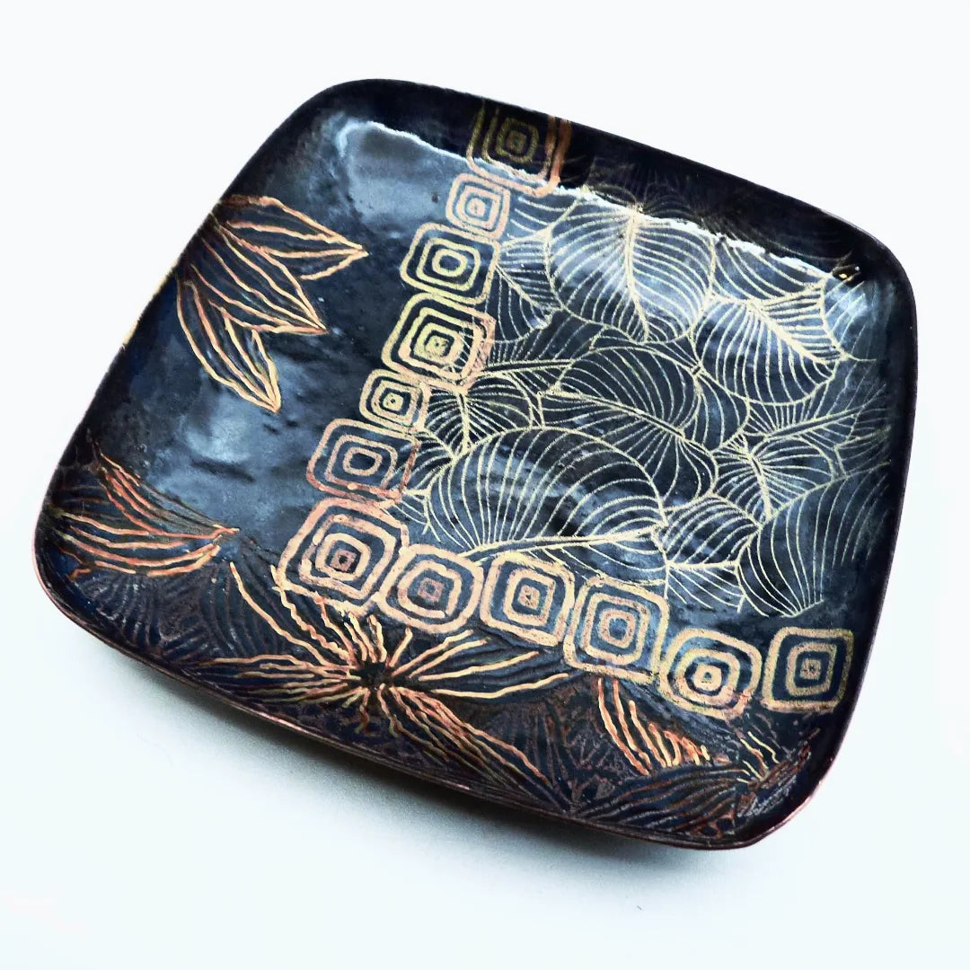 The copper bowl is carefully cleaned and prepared in order to accept the enamel. Then, I apply multiple layers of enamel, which is finely powdered glass, and photo-transferred patterns. The layers of enamel are fused to the copper on both sides in a 1500 degree kiln. This firing process is repeated several times. Finally, I add hand-painted accents.