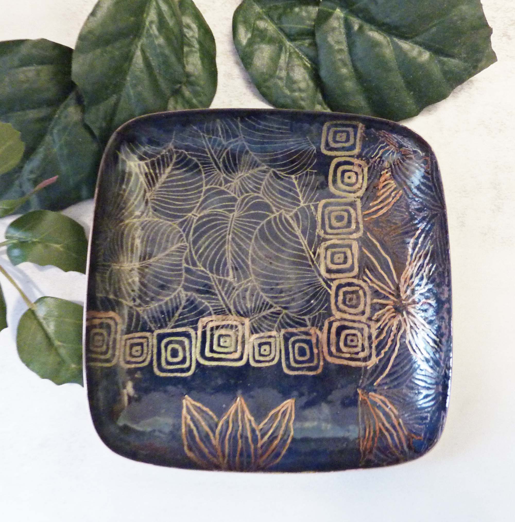 Measures 4 1/2" in each side and 5 1/2" from corner to corner, and is signed on the bottom. Dish will arrive in a box with ribbon and gift tag, ready for gifting. Not to be used for food.