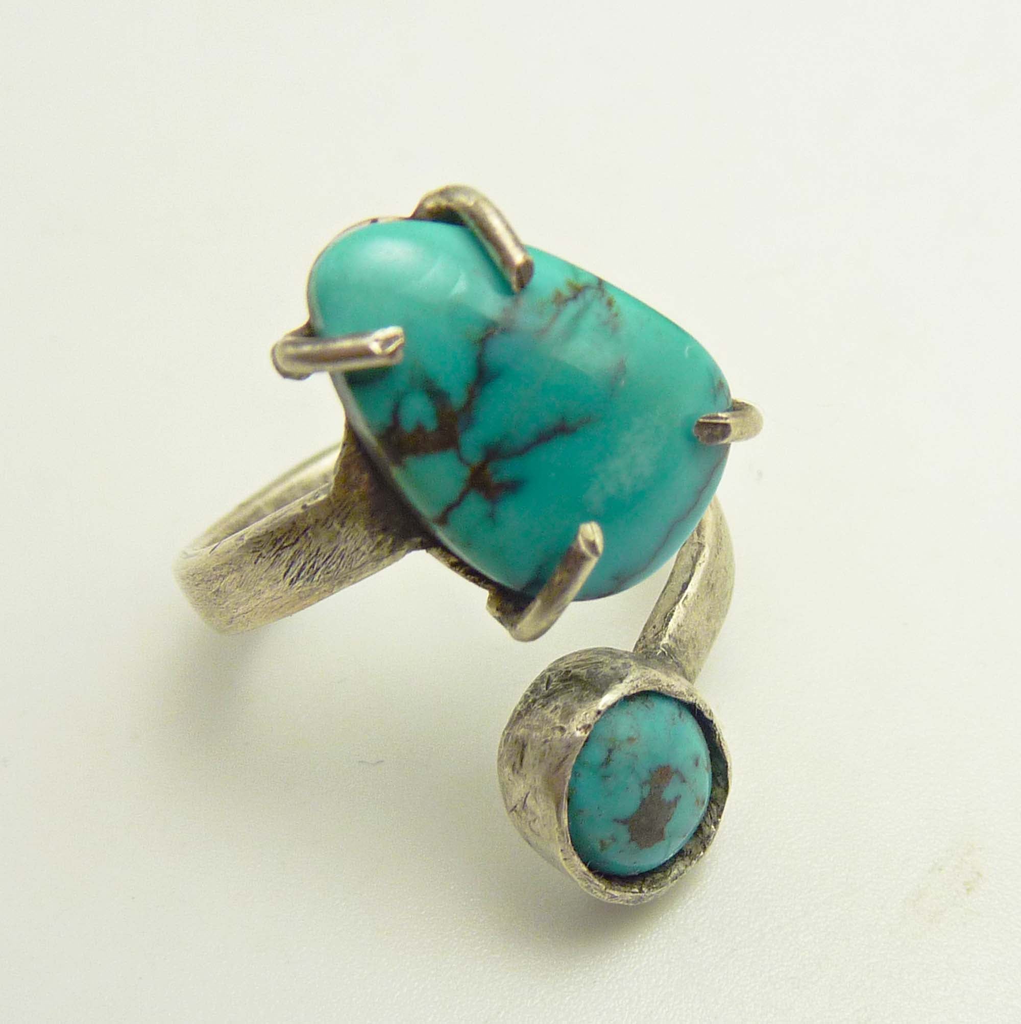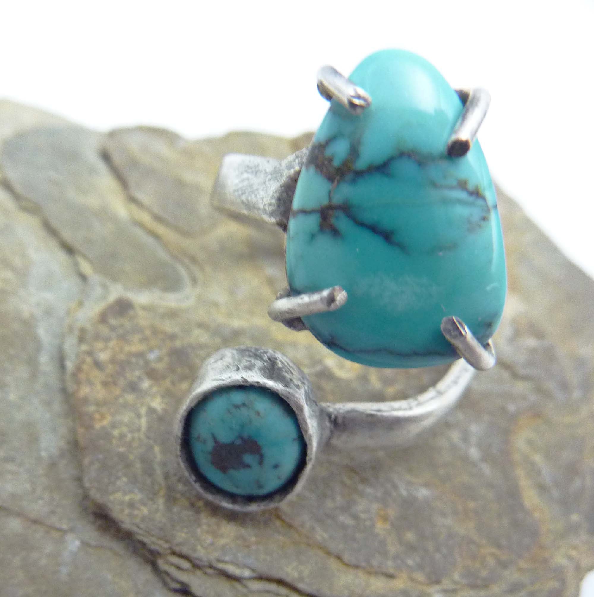 Two stunning turquoise stones combine in one sterling silver ring. One stone is prong-set and the other is bezel-set. The open band curves around the finger. The ring is set at a size 6 1/2, but could go down to about a 6 and up to about a size 7 1/2. The sturdy band measures 3mm wide and 2mm in depth. The pear-shaped turquoise measures 15x11mm and the oval stone measures 9x7mm. Completely handmade in my Chicago studio and one of a kind; this is a unique, one-of-a-kind ring.