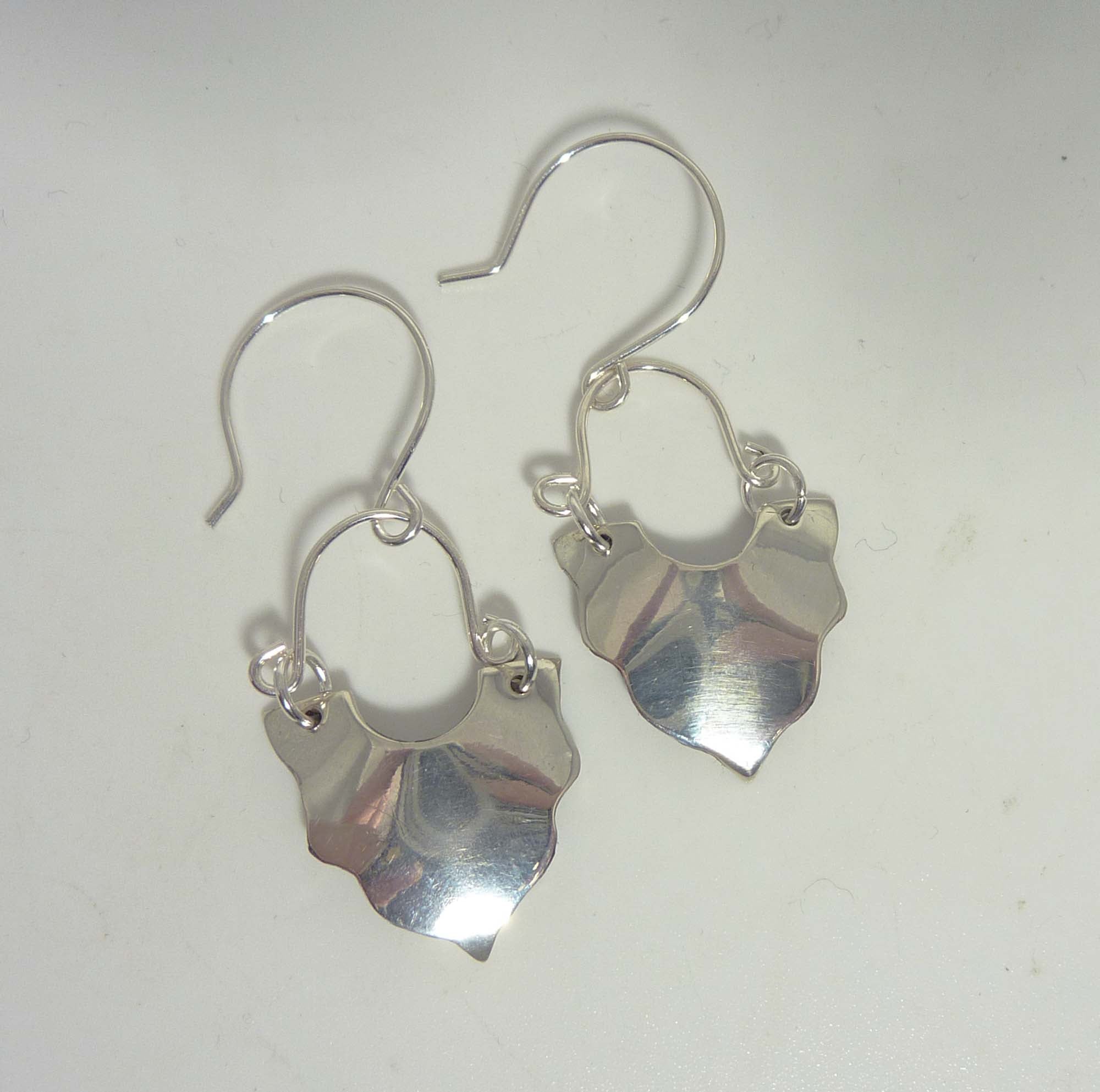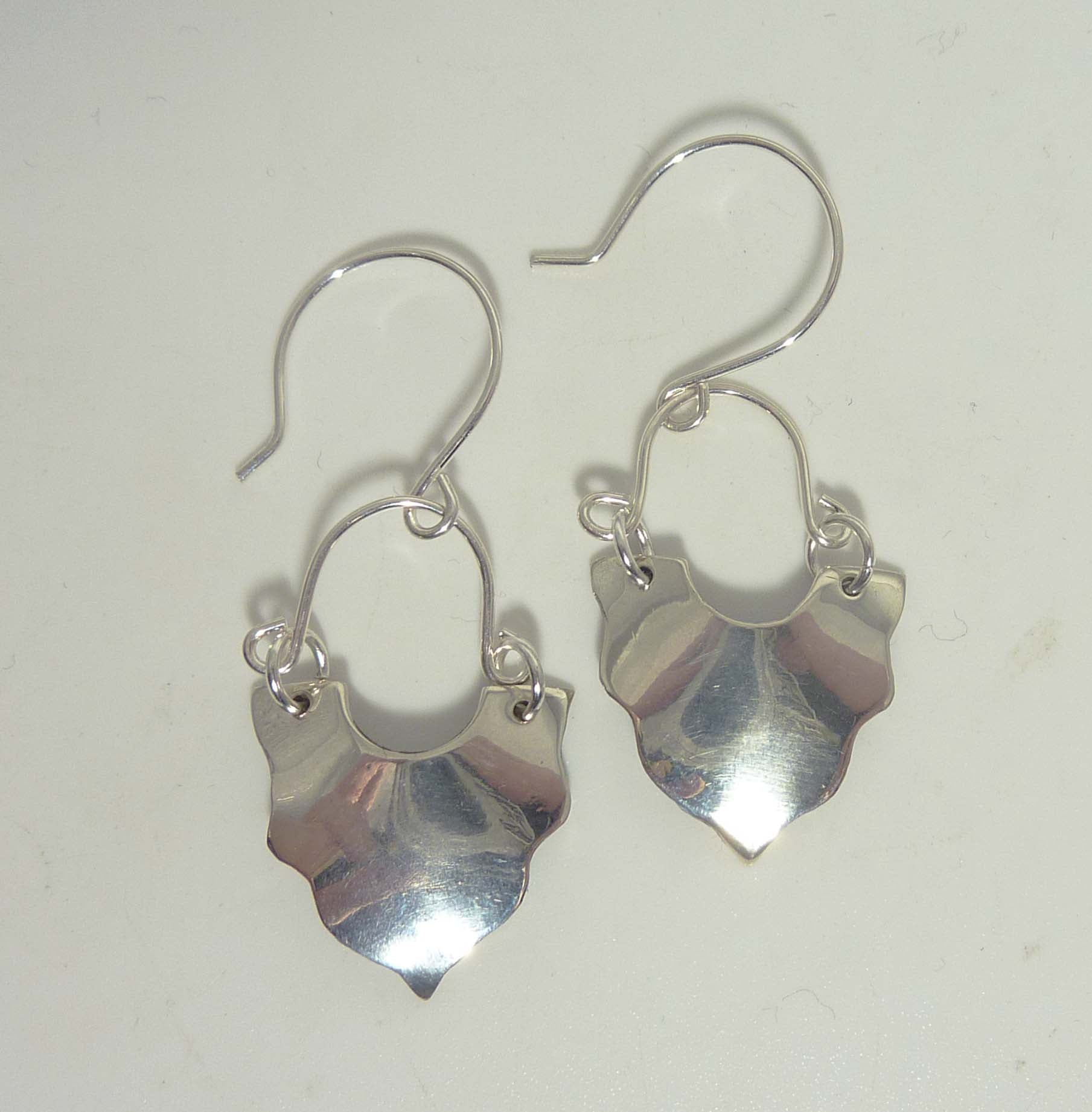 Wear these beauties with just about anything! Sleek Moroccan-inspired shapes are hand-sawed and formed from sterling silver sheet. They are domed for extra dimension and have been given a high polish for brilliant shine. Sterling silver connectors and ear wires.
